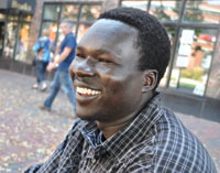 I’m at the Telling Room in Portland, a large upstairs room on Commercial Street facing the busy waterfront, where teenagers come to write with the support of professional writers. Patty Hagge is one teacher, a striking woman with pure white hair. She tells me about two writers who came to Portland and changed Kenyi’s life: Valentino Achak Deng and Dave Eggers. They spoke to young writers there and read from What is the What, Eggers’ book based on Valentino’s memories of Sudan. Here is the audio of their talk. “From the time Kenyi met them,” Patty tells me, “he said he wanted to write his story and we said, we will help you.”